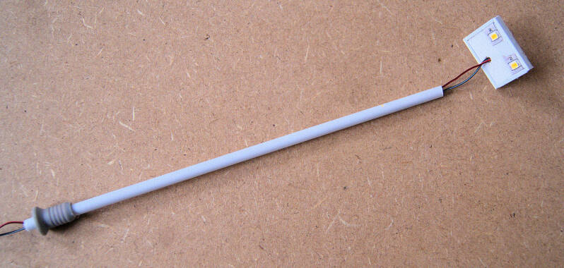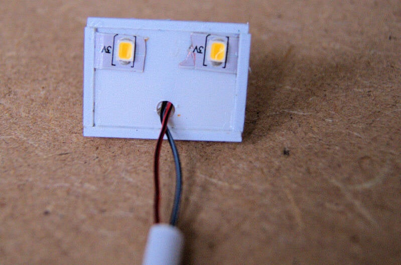 In de vervaardigde lichtkappen, van 2.4 x 1.6 x 0.25 cm breng ik 2 ledlampjes van 2 x 2 mm aan van